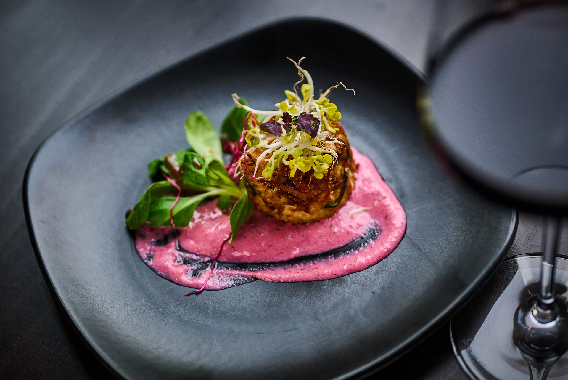 Feines Fleischgericht mit Sauce, Gemüse und Rotwein auf elegant gedecktem Tisch im Restaurant.